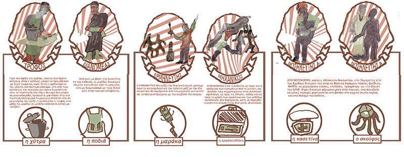In a record of increasing cases of natural disasters and humanitarian crisis, the need arises to establish a group of volunteer solidarity workers who will appear in a second year, relieving the immediate rescuers and supporting the affected, with nutritional, pharmaceutical and psychological coverage, the latter through the addition of street theater. The research begins in the region of Thessaly, which is plagued by flooding phenomena, showing the accelerating climate disaster. It finds correspondences in the course of the volunteer corps with the wandering theatre troupes, in order to ultimately combine their accommodation practices, so as to enrich and renew their mechanisms of movement and provision of assistance, to add to their services the mental stimulation, through collective design and reuse, the language of theatre, which was the only cultural element that survived in the most difficult situations, and finally to create a network of communication and unity between the volunteers, and the affected people of each area. In this work, the Pelion region is analyzed and in particular the village of Kato Lechonia, which was flooded twice in September 2022. For the needs of the volunteer group, the proposal includes the redesigned transport vans of the volunteers, along with their equipment, a wheeled construction for distributing goods and collecting waste, and a series of objects, the result of collaborative design. and transformation of volunteers with the residents, aiming to use them in the theatrical works that will be presented. The solidarists meet the Balkan ‘bouloukia’ and the ’Theatre du Soleil’, using mechanisms and systems of organization of the troupes, to create this special group.